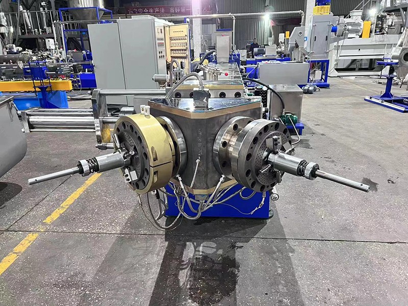 生產KTE-75D三螺桿鹽白填充母粒,一機雙切,產量為3000Kg/h。